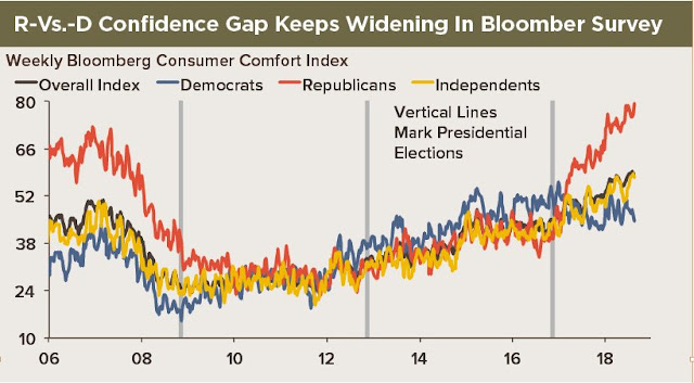 The first problem is how consumer and business confidence is measured. Jim O’Sullivan observed a significant partisan divide in the Bloomberg consumer comfort figures.
