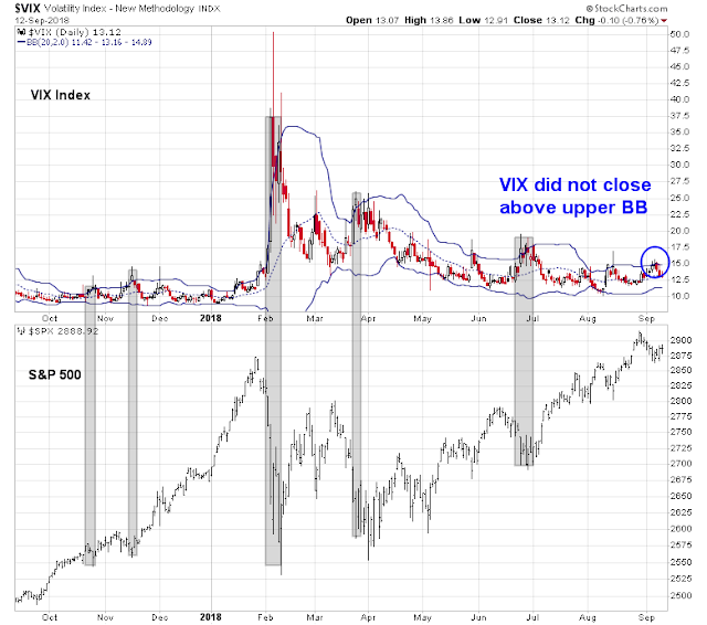 The market also flashed a number of imperfect buy signals, where various indicators neared buy signal levels, but never quite got there. As an example, the VIX Index breached its upper Bollinger Band on an intra-day basis, which would be an oversold condition for the stock market, but never closed there. Nevertheless, the market began to advance after that near-oversold condition.