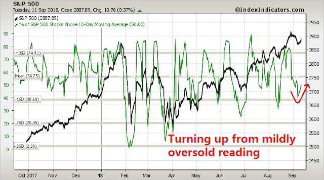 Short-term breadth indicators from Index Indicators tell a similar story. The % of stocks above a 10 dma neared an oversold reading and began to mean revert and turn up.