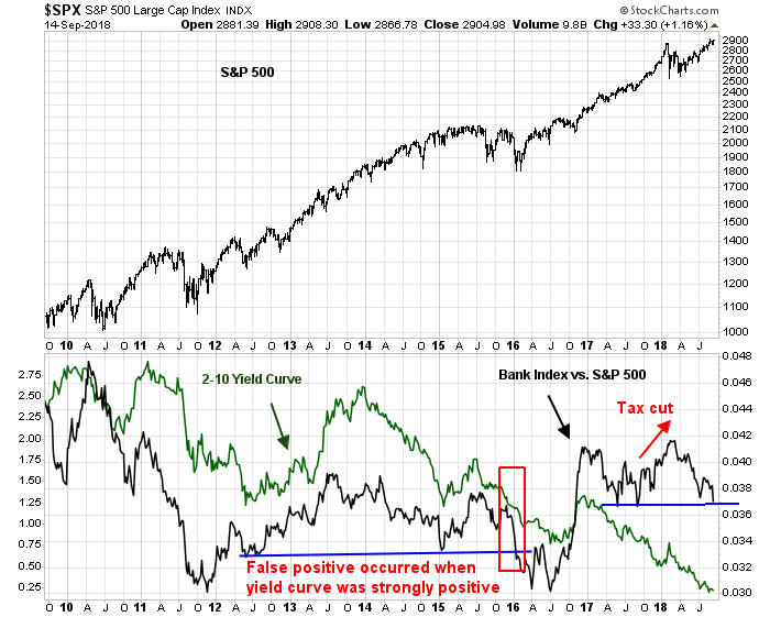The chart below depicts the relative performance of the KBW Bank Index (BKX). In the past, technical breakdowns of relative performance have foreshadowed major market tops with the exception of one false positive in late 2015/early 2016.