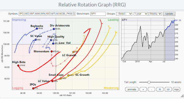 As an explanation, RRG charts are a way of depicting the changes in leadership in different groups, such as sectors, countries or regions, or market factors. The charts are organized into four quadrants. The typical group rotation pattern occurs in a clockwise fashion. Leading groups (top right) deteriorate to weakening groups (bottom right), which then rotates to lagging groups (bottom left), which changes to improving groups (top left), and finally completes the cycle by improving to leading groups (top right) again.