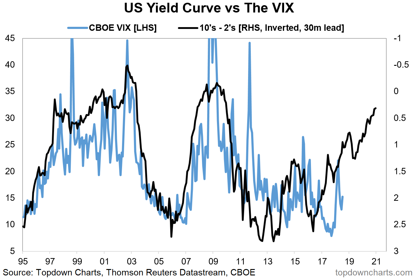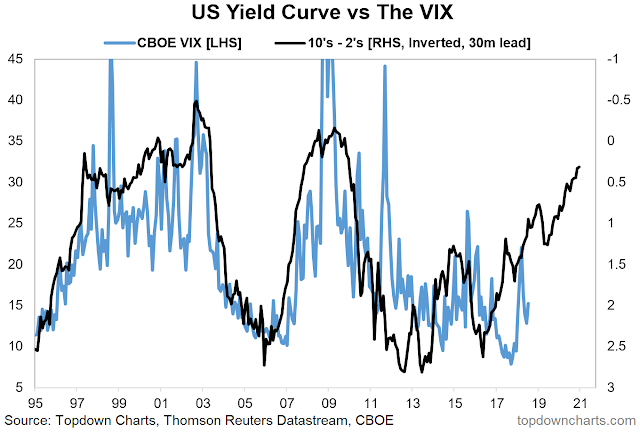 If I am correct in my analysis, then expect the yield curve to continue to flatten as the Fed continues to tighten monetary policy. For equity investors, this translates to greater volatility in the future. Analysis from Callum Thomas of Topdown Charts indicates that the shape of the yield curve leads equity volatility.