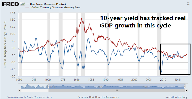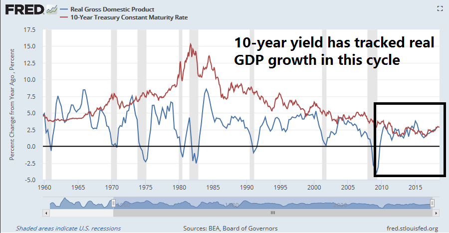 Let`s unpack that analysis. First, we can observe that the 10-year yield has closely tracked real GDP growth this cycle. Tactically, betting on a regime shift where yields normalize to some higher premium level amounts to a “this time is different” bet. Do you really want to do that?