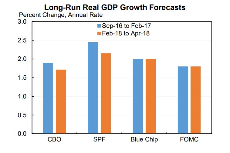 On the other hand, the same long-run growth forecasts from the same sources have been steady. Arguably, they have declined slightly.