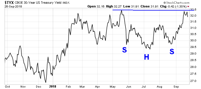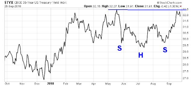 Increasingly, there has been more and more bearish calls for bond prices (and bullish calls for bond yields) as the Fed continues its rate normalization program. Some analysts have pointed out a nascent inverse head and shoulders formation on the 30-year yield (TYX). With the caveat that head and shoulders formations are never complete until the neckline is broken, a decisive upside breakout in TYX would be bad news for long Treasury prices.
