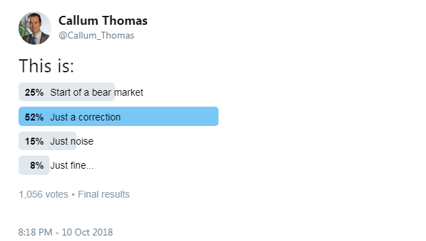 When the market selloff began last Wednesday, Callum Thomas conducted an (unscientific) Twitter poll asking if this is a correction, the start of a bear market, or just market noise. The overwhelming response favored a correction, which is contrarian bearish from a sentiment viewpoint.