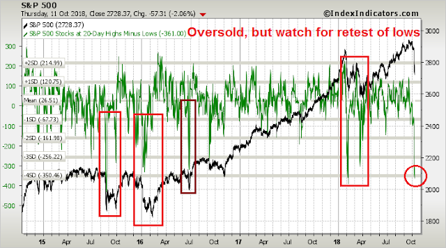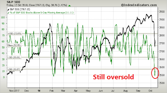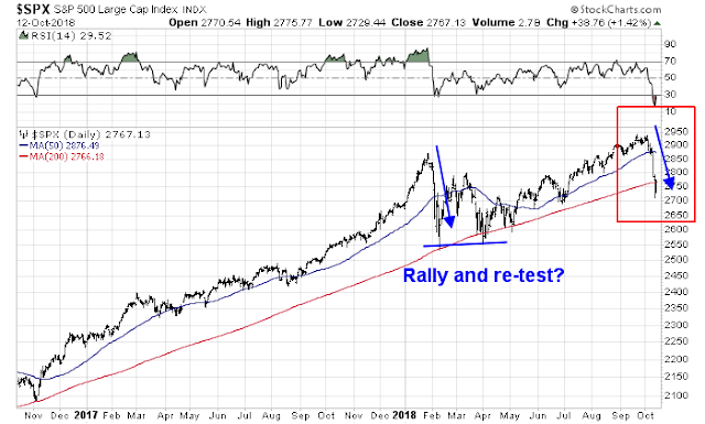 However, it is also becoming apparent that the stock market is poised for an oversold bounce. Subscribers received an email alert after Thursday`s close indicating that the short-term trading model had turned bullish. Breadth indicators were oversold across multiple time frames. That said, past instances of these oversold extremes resolved themselves with an initial rally, followed by a retest of the lows some days and weeks later.