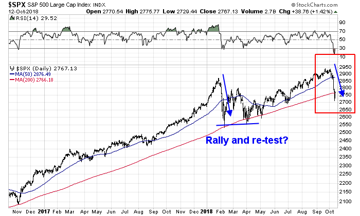 Looking to the week ahead, the market has suffered much technical damage in a very short amount of time. It is highly unusual for stock prices to suddenly fall from an all-time, slice through the 50 day moving average (dma) support, and then cratered to the 200 dma, all in less than two weeks. It is difficult to believe how the bulls could regain control and proceed as if nothing happened with a V-shaped recovery. The last time this happened was the February correction after the January blow-off. The market rallied, but returned to test its lows about two months later.