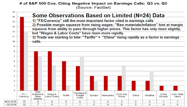 There were, however, some macro insights from the limited number (N=24) of earnings calls so far. While companies cited the strong USD as the greatest headwind to earnings results, there are signs that rising wages are beginning to pressure margins. As well, the trade war is starting to bite as “tariffs” and “China” are increasingly being cited as the negative operating factors.