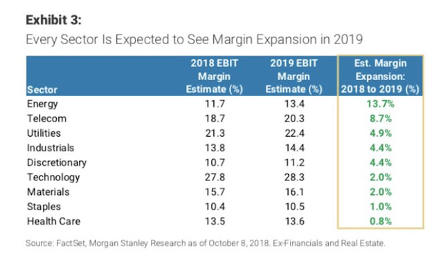 The last major risk to the bull case comes from overly optimistic earnings expectations. Analysis from Morgan Stanley shows that the Street expects margin expansion in every non-financial sector in 2019.