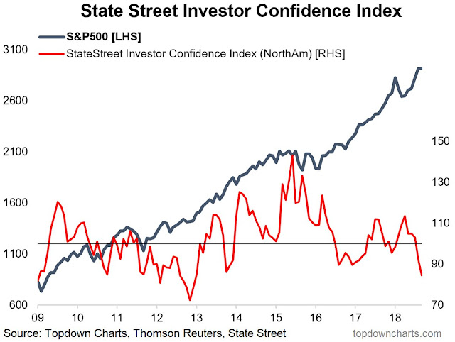 By contrast, various institutional surveys have shown that institutions are generally cautious on equities, which would put a cushion on stock prices if they decline. Callum Thomas highlighted data from State Street’s custodian data, which shows that US investors are already defensively positioned.