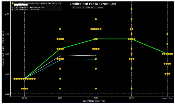 But just how much more does the 10-year need to rise to reflect Fed policy expectations? Very short-term rates could rise a little further, but longer-term rates are about reflecting the terminal Fed funds rate for this cycle. That is, the market could fully discount the Fed’s dot plot via curve flattening. As previously stated, the 10 year treasury bond yield is just the sum of the expected future short-term rates. At the end of the rate hiking cycle, those expectations should configure themselves such that the 10 year bond equals the terminal Fed funds rate. The median Fed member’s terminal Fed funds rate is currently 3.375%, just 17bps higher than the current 10 year treasury yield. The weighted average Fed member’s terminal Fed funds rate is 3.28%, just a few basis points higher than the current rate. This tells is that the rise in yields may be closer to its end than its start, but there is still a little to go to completely discount Fed policy, especially on the short end of the curve.