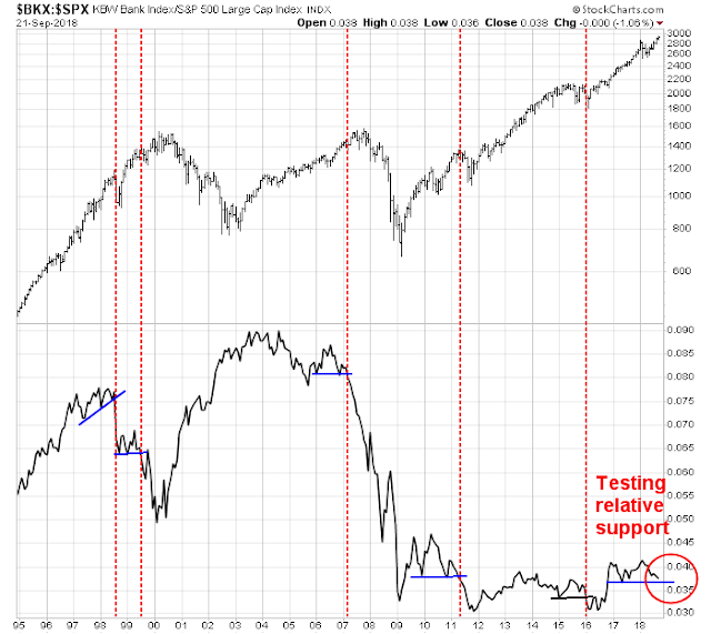 First, the relative performance of bank stocks has been a good real-time warning of rising stress in the financial system. These stocks have been weak on a relative basis and they are on the verge of testing a key support level. Watch for a technical breakdown, which hasn’t happened yet.