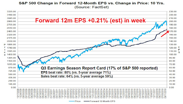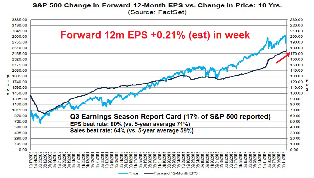 In the past week, the bottom-up fundamentals were strong, but the market did not respond to the good news. Q3 earnings season is under way, and the latest update from FactSet shows that both the EPS and sales beat rates were well above the historical averages. Moreover, Street analysts continued to revise earnings upwards, indicating positive fundamental momentum.