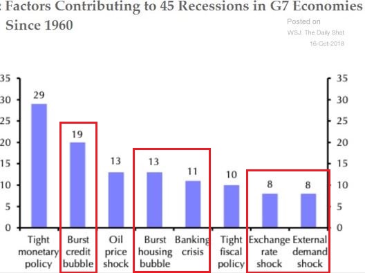 The WSJ recently posted the factors leading to the past recessions in G7 economies since 1960. Of the 111 factor occurrences, China is at high risk in 59, or 53%, of those instances, if you add in the potential of a currency war, as well as a trade war.
