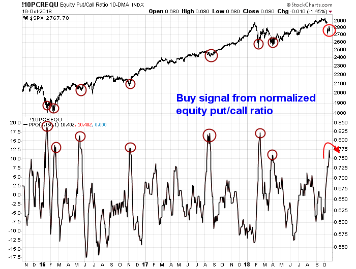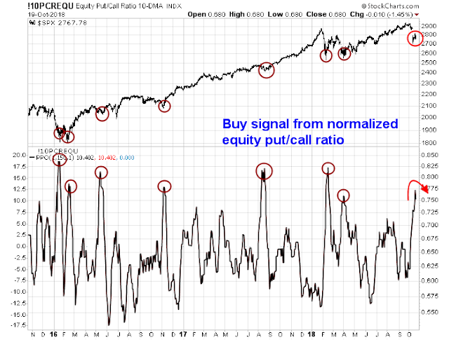 That said, the market is likely too far off. The normalized equity-only put/call ratio flashed a buy signal by reaching a panic extreme level and began to mean revert.