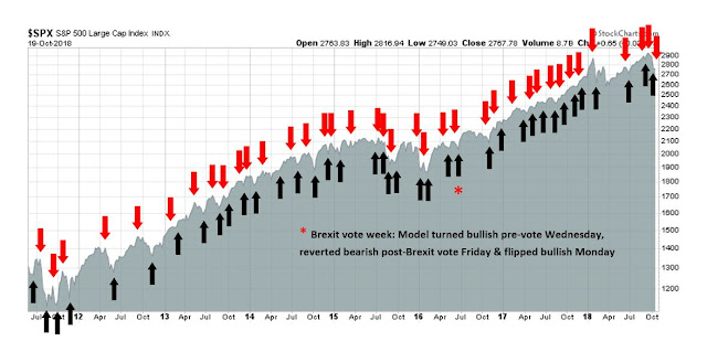 My inner trader uses the trading component of the Trend Model to look for changes in the direction of the main Trend Model signal. A bullish Trend Model signal that gets less bullish is a trading “sell” signal. Conversely, a bearish Trend Model signal that gets less bearish is a trading “buy” signal. The history of actual out-of-sample (not backtested) signals of the trading model are shown by the arrows in the chart below. The turnover rate of the trading model is high, and it has varied between 150% to 200% per month.