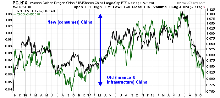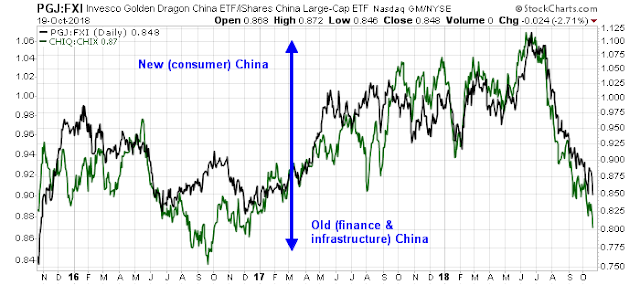 Notwithstanding the highly manipulated economic statistics coming from China, I have been monitoring the real-time signal of the China rebalancing theme using my long New (consumer) China ETF and short Old (finance and infrastructure) China ETF pairs for quite some time. The two pairs consist of long Invesco Golden Dragon China (PBJ) and short iShares China (FXI), and long Global X China Consumer ETF (CHIQ) and short Global X China Financial ETF (CHIQ). As the chart below shows, New (consumer) China has been dramatically underperforming Old (finance and infrastructure) China.