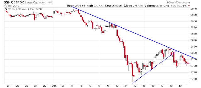 The hourly chart shows that the S&P 500 broke down out of a rising trend line (dotted line) Thursday, and rallied up to test the falling trend line Friday. These are the hallmarks of a relief rally failure indicating that a likely test of the old lows is likely underway. Subscribers received email alerts when my inner trader was stopped out of his long positions Thursday, and his entry into an initial short position Friday when the market strengthened to test the falling trend line.