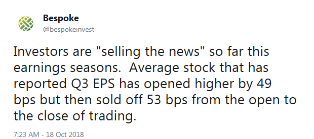 Bespoke also observed that the market was “selling the news”, as stocks that reported, regardless if the results were positive or negative, opened higher but closed lower on the day.