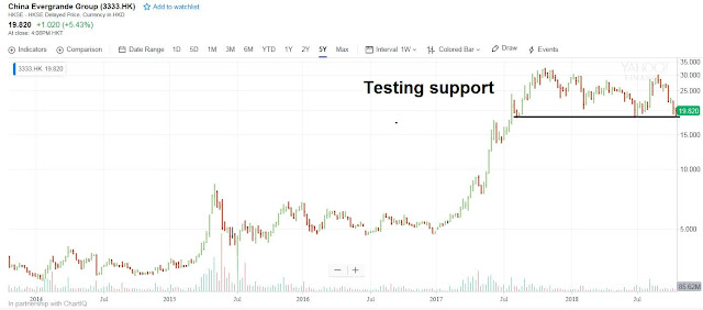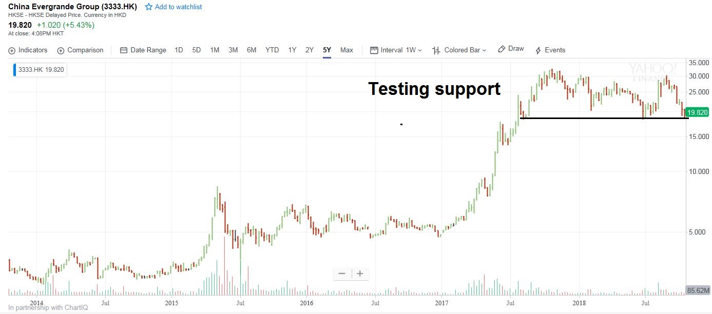 As official statistics from China tend to be unreliable, I rely on indirect real-time market-based indicators for clues to the healthy of the economy. Here are the shares of China Evergrande Group (3333.HK), which is one of the largest property developers in China. The stock is resting at a key support level.