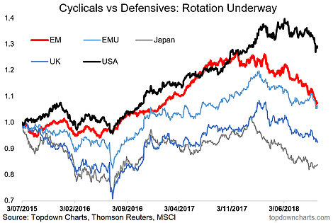 The emergence of defensive sectors is actually global in nature. Callum Thomas of Topdown Charts documented how the cyclical to defensive performance ratio has been rolling over all around the world. The US is just a little late to that party.