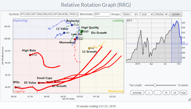 I use the Relative Rotation Graphs, or RRG charts, as the primary tool for the analysis of sector and style leadership. As an explanation, RRG charts are a way of depicting the changes in leadership in different groups, such as sectors, countries or regions, or market factors. The charts are organized into four quadrants. The typical group rotation pattern occurs in a clockwise fashion. Leading groups (top right) deteriorate to weakening groups (bottom right), which then rotates to lagging groups (bottom left), which changes to improving groups (top left), and finally completes the cycle by improving to leading groups (top right) again.