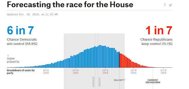 As the US approaches the midterm elections, the consensus is that the Democrats take control of the House while the Republicans retain control of the Senate. The latest FiveThirtyEight forecast shows that the Democrats have a 6 in 7 chance of controlling the House.