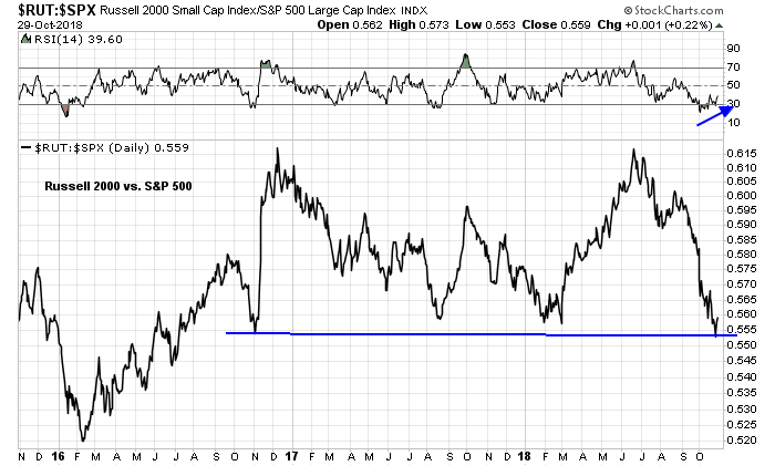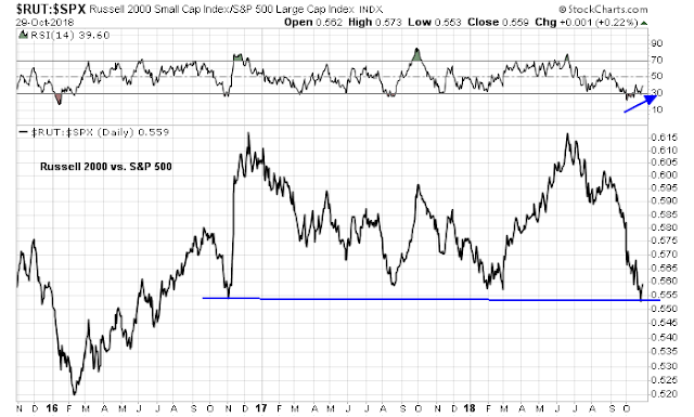 A less controversial idea is the revival of small cap stocks. The small cap Russell 2000 is testing a key relative support level, while exhibiting a positive RSI divergence. If the market were to rally, small cap stocks represent a high-beta group that has the potential to outperform.