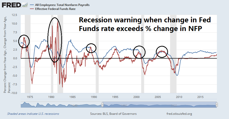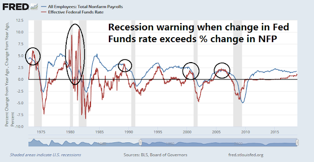 In a separate model, New Deal democrat also found that whenever the change in the Fed Funds rate exceeded the change in Non-Farm Payroll employment, a recession has been the result.