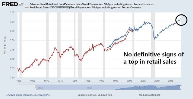 As well, retail sales may be topping out, though the evidence is not definitive. Retail sales to population made a top five months ago, but New Deal democrat indicated he does not want to call a top until he sees six months of weakness.