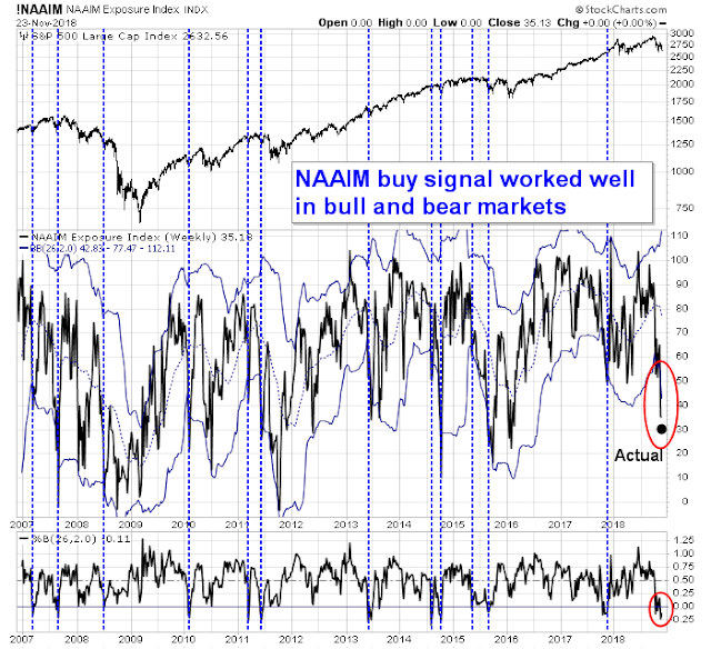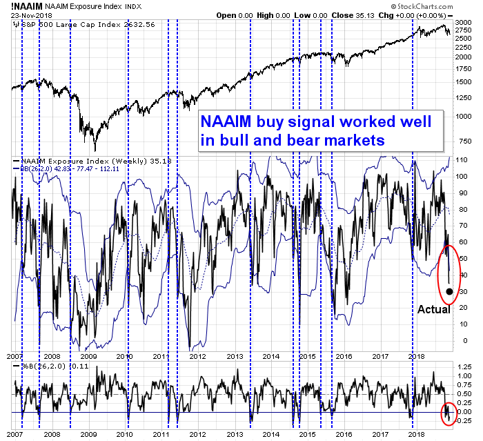 The NAAIM Exposure Index, which measures RIA sentiment, fell from 35.1 to 30.6 last week. In the past, the market has shown little downside risk and high upside potential whenever the NAAIM reading has fallen below its 26-week lower Bollinger Band. The previous reading of 35.1 was already below the lower BB, and the latest indicates an even more crowded short extreme.