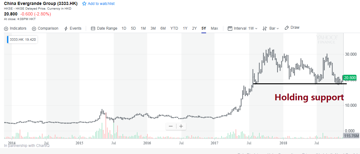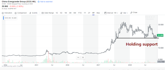 I have been monitoring the share price of key Chinese property developers, such as China Evergrande (3333.HK), which are highly levered. So far, the shares are holding support.