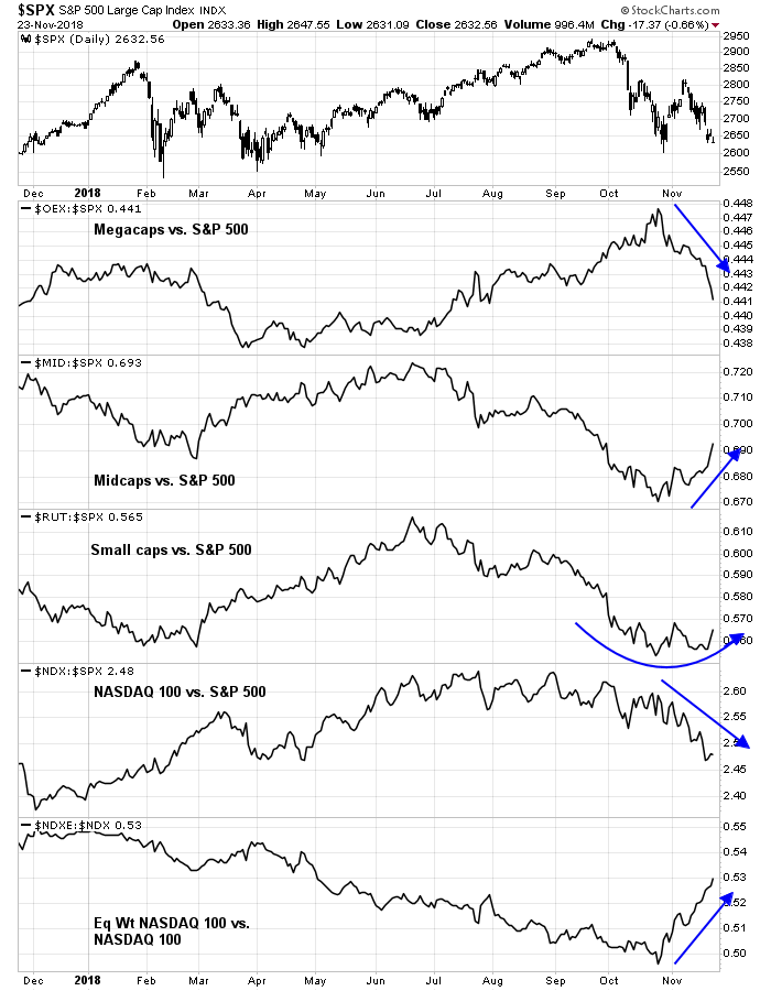 Risk averse traders who don’t want to take a directional bet may find better relative performance in the mid and small cap stocks with a long mid/small cap and short large cap pair trade.