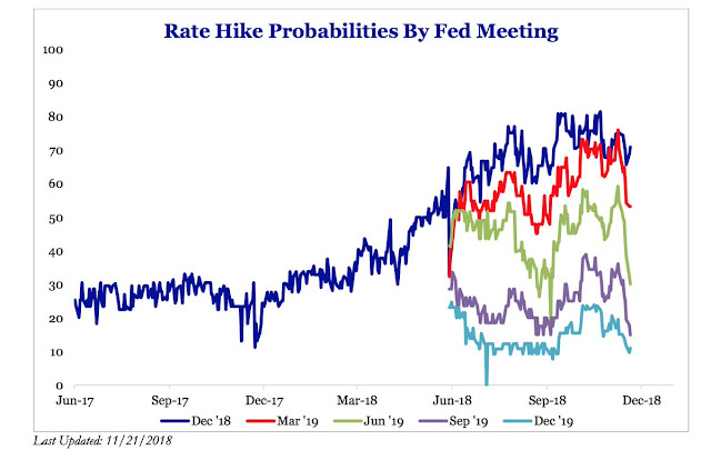 What’s going on here? The challenge for the Fed is managing an economy that is transitioning through an inflection point. The odds are very high that economic growth slows markedly next year. The lagged impact of the Fed’s seven rate hikes over the last two years (which is already evident in housing), fading fiscal stimulus and slower global growth all point in this direction. That is the Fed’s baseline forecast as well.