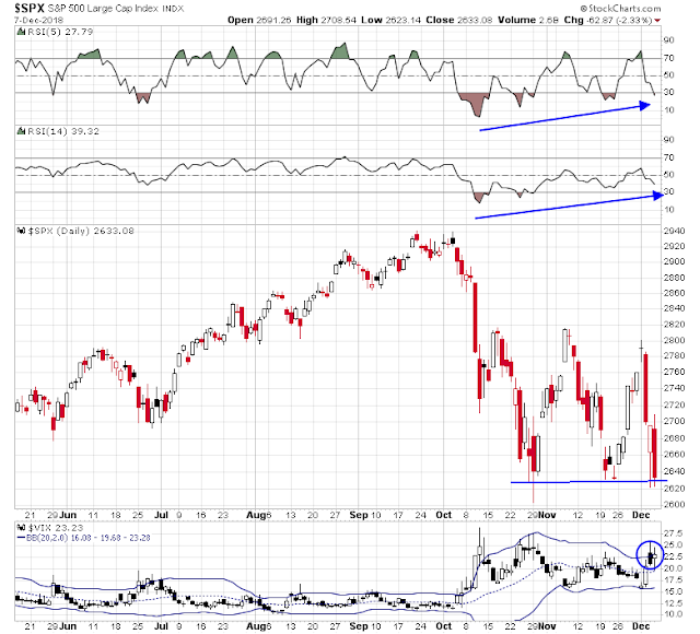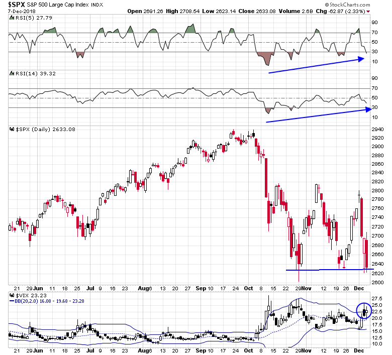 The SPX closed the week by testing its November lows while exhibiting positive RSI divergences. In addition, the VIX Index is within a hair of its upper Bollinger Band, which is indicative of an oversold condition.