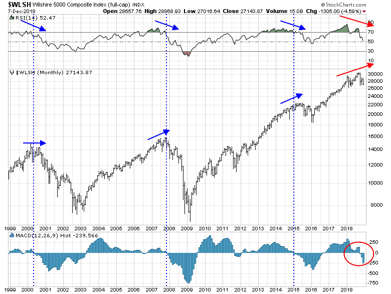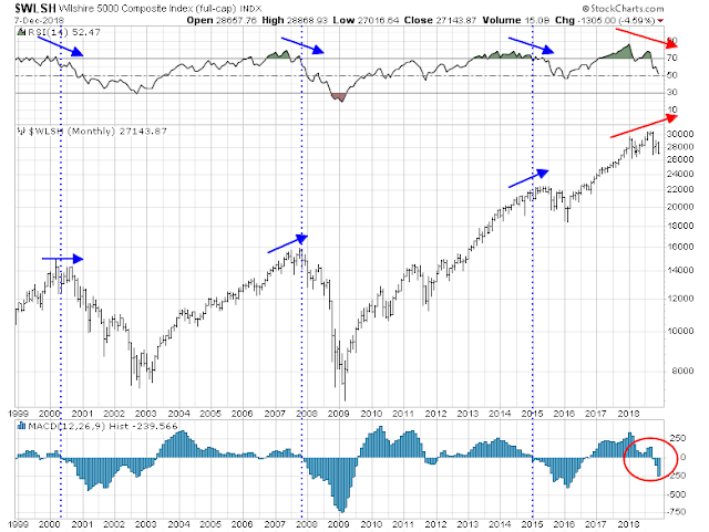 The recent volatile market action bears the signature of a bear market. Longer term, I have warned on multiple occasions about the negative RSI divergence and MACD sell signal on the monthly Wilshire 5000.