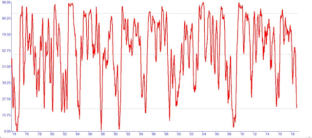 The late Marty Zweig is well known for his breadth thrust indicator. Less well known is his high-low index measuring the 60-day ma of the ratio of NYSE 52-wk highs to 52-week lows. The attached chart shows that his index is now on a par with previous cyclical lows since 1974.