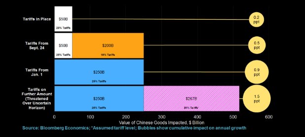 The effects of the scheduled January 1 tariffs are highly consequential for both countries. The chart below shows the project effects on Chinese GDP growth if the existing tariff rate rose from 10% to 25%, and the effects if Trump were to impose tariffs on all remaining imports from China. The IMF also projected that US GDP growth would decelerate by 1% in the event of a full-blown trade war.
