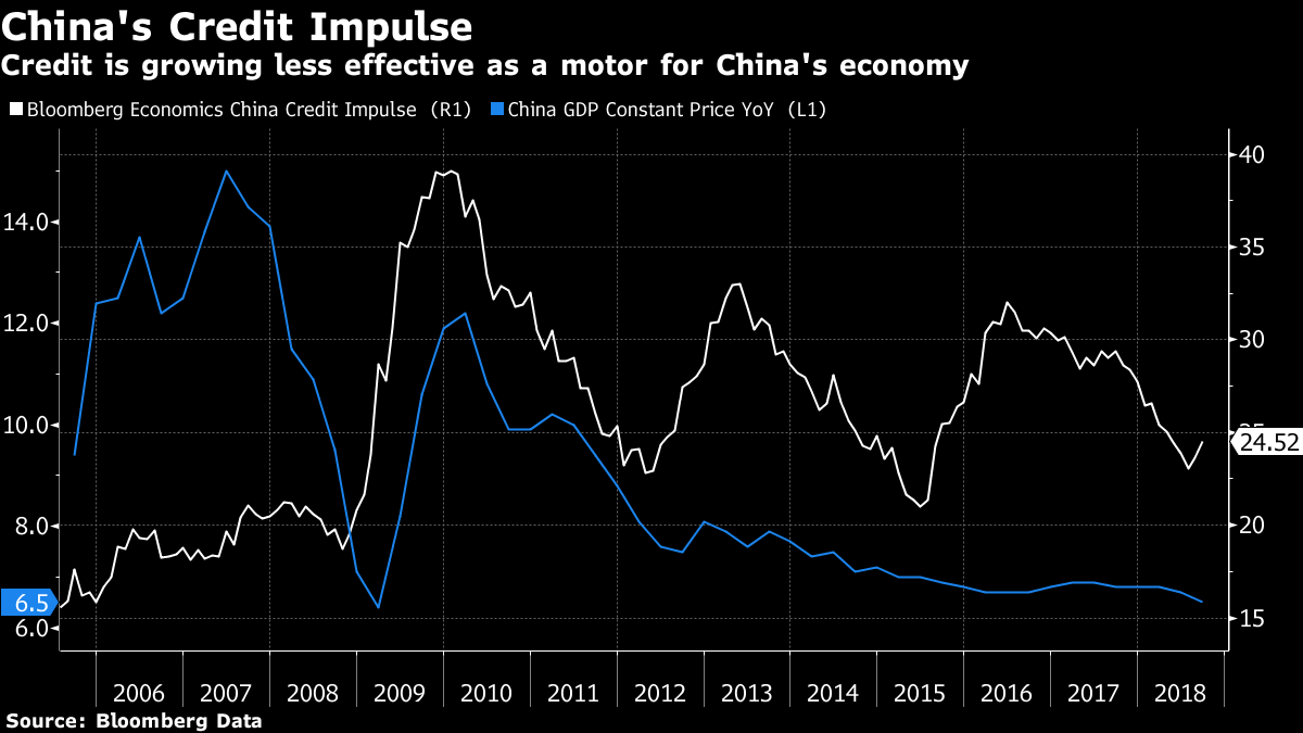 The Chinese economy was already slowing before the onset of the trade war. Much of the moderation in growth was engineered by Beijing in order to better control burgeoning debt. That said, John Authers recently pointed out that efforts at further credit driven stimulus is not having the expected response because of the law of diminishing returns.