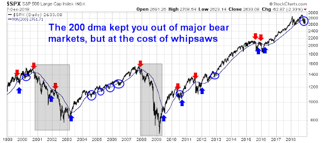 The chart below shows how a simple 200 dma as a buy and sell signal would have worked for the SPX in the last 20 years. The good news is it kept you out of major bear markets, but at the cost of numerous whipsaws, which are circled.