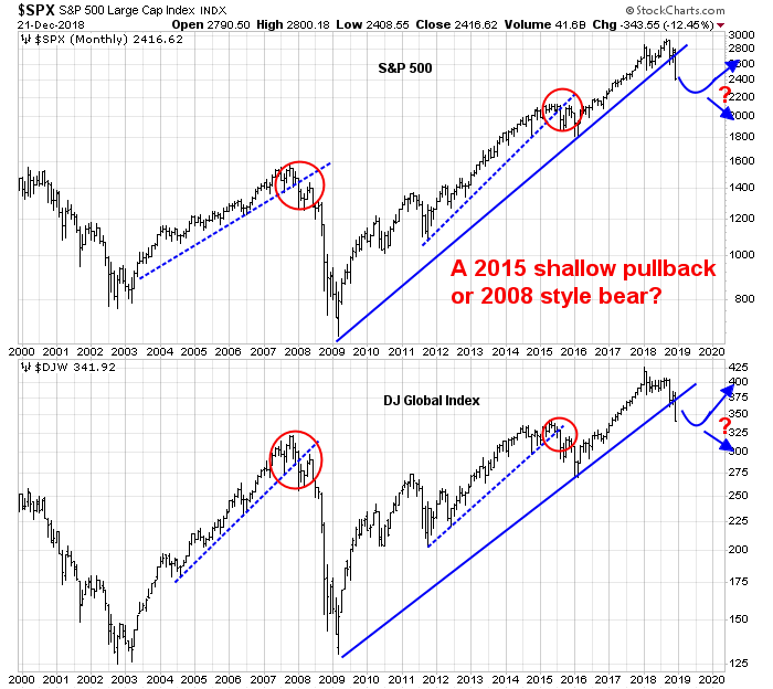 Further analysis reveals that investors are discounting only a mild US slowdown in 1H 2019, but no recession. From a technical perspective, both the US and global markets have violated well-defined uptrend lines, just as they did in 2015 and 2007. It remains an open question as to whether the trend line breakdowns will result in just a mild pullback, or a deeper bear market. (Please note that the curves and arrows drawn on the charts are only stylized, and do not represent technical projections or targets).