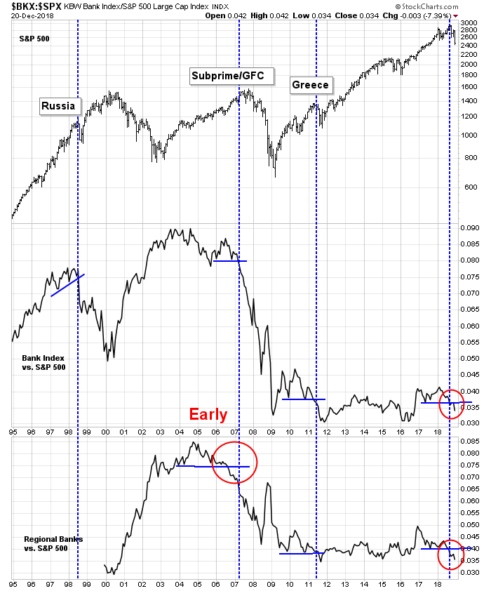 One of the best real-time indicators of the financial cycle is the relative market performance of bank stocks. Past technical breakdowns of bank stocks have signaled periods of financial stress, and the relative performance of regional banks (bottom panel) have shown to be an even more sensitive barometer. Bank stocks recently violated a key relative support line, which is an indication that the financial cycle is turning down.