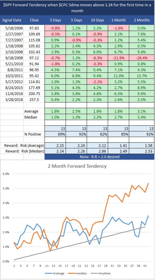 Looking ahead to the next few week, to say that the market is oversold is an understatement as readings are now at off-the-charts levels. The CBOE put/call ratio (CPC) reached 1.82 last Thursday, which is the highest level in its history since 1995. A historical study shows past SPY returns when CPC 5 dma crosses above 1.24 for 1st time in a month, n=13 since 1995. 92% closed higher within 5 days with average return of 2.5%.