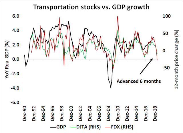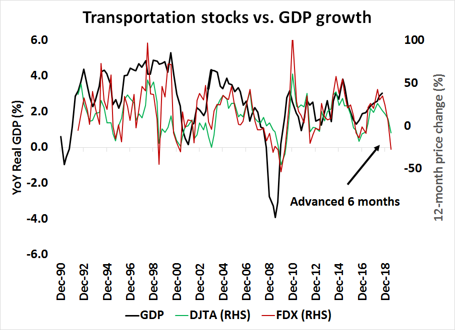 The transportation sector is a highly cyclical sector and represents a short leading indicator of economic growth. The recent FedEx (FDX) earnings report was disturbing, as the company stated “global growth has slowed but we are very surprised by the magnitude of the headwind, which is what might be seen in a severe recession”. The price performance of FDX and the DJ Transports has historically led GDP growth by roughly six months, and they are pointing to a sharp deceleration in economic growth. However, I would not characterize the decline to be severe enough to declare a recession (yet).