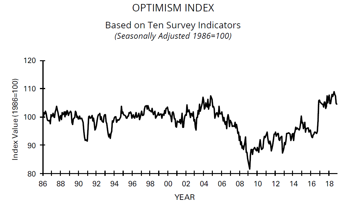 For a better read on the state of the economy, the latest NFIB small business survey is revealing, as small businesses have little bargaining power and they are therefore a good barometer of the economy. NFIB optimism is coming off the boil, but remains elevated. This is consistent with the observation from Powell and others that the economy is in a good place, and “most of the hard data that we see coming in remain quite solid and suggest ongoing momentum heading into 2019”.