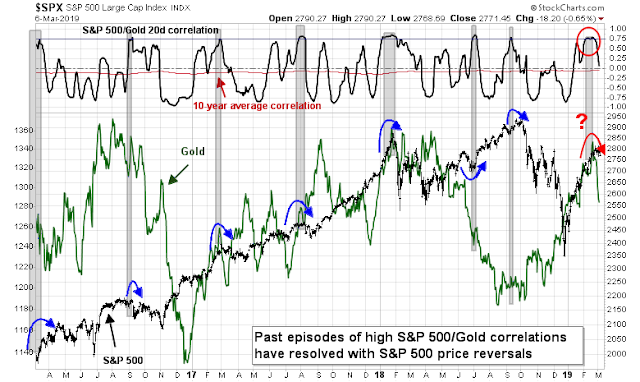 I pointed out before that stock and gold prices have been unusually correlated in the rally off the December bottom. Such instances of high correlation tended to be resolved with a stock price reversal, which we seem to be seeing the beginning of.