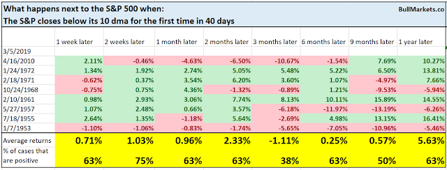 The SPX breached its 10 dma today after a prolonged advance. Statistical analysis from Troy Bombardia indicates that such episodes tend to be short-term bullish, though the market is down 62% of the time after three months.