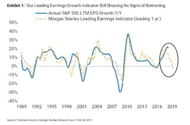 Business Insider reported that Morgan Stanley sounded a similar warning. Leading indicators are declining, and investors should be prepared for falling earnings growth.