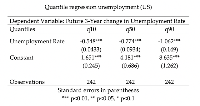 The results of such a regression are displayed in the table below. All three coefficients are negative (which is what one would expect as there is reversion to the mean in unemployment rates). But the interesting part is that the size of the coefficient increases as we move from small changes in unemployment to large changes (from q10 to q90). This means that low unemployment rates are particularly good at predicting the tail risk of large increases in unemployment (recessions)